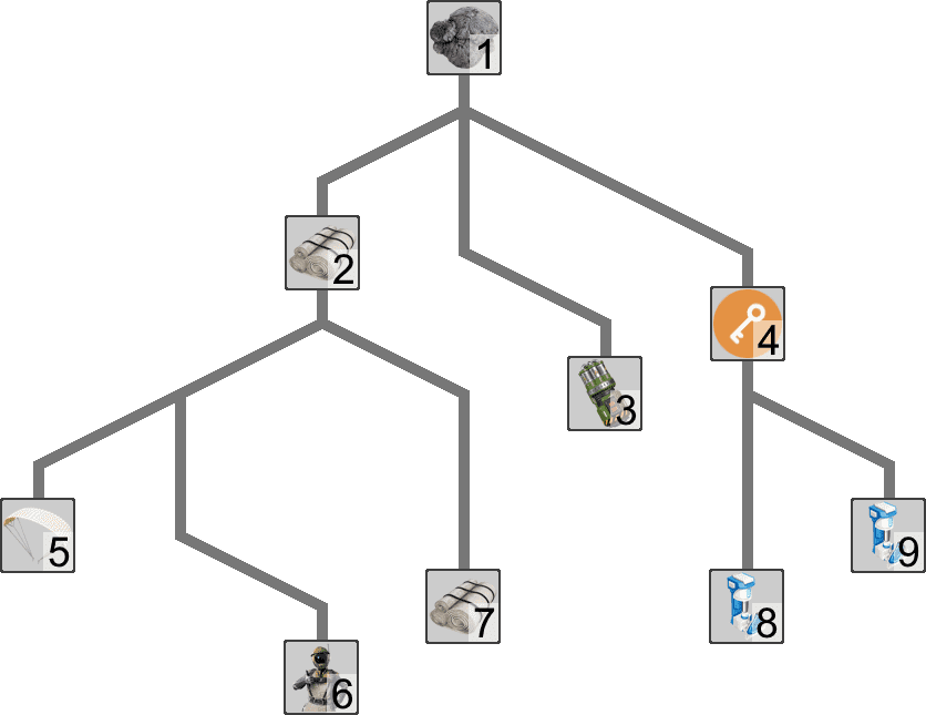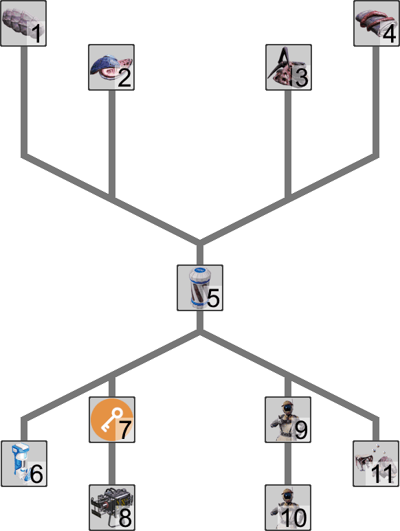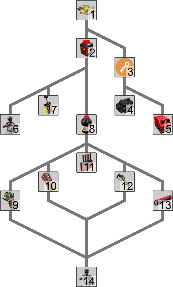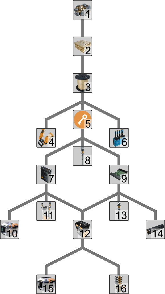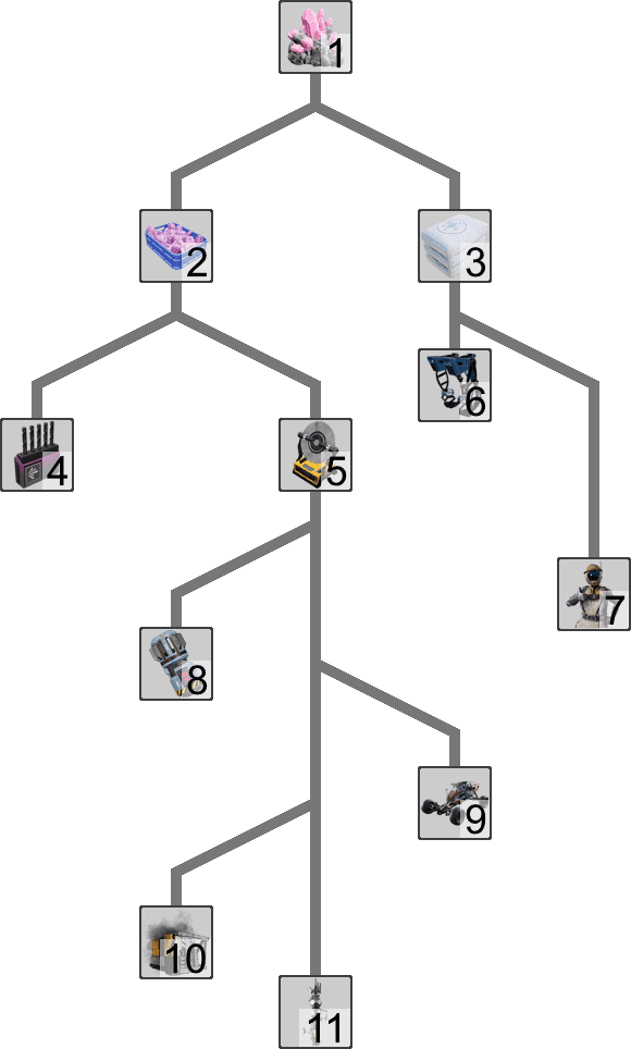 Unlocks are separated into different research 'trees', and each tree is initiated by picking up a certain item as hinted by the MAM's interface. For example, picking up a Caterium Ore unlocks the Caterium Research Tree. Each technology research will unlock the research node(s) below it. The research tree is completed when all research nodes in the tree are unlocked. The MAM will indicate this progress through a percentage in the UI. Research trees are independent of each other and to the HUB's Milestones, however, some of the research may require ingredients that are locked behind Milestones.